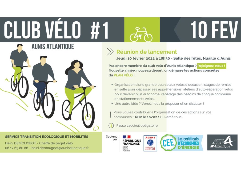 La Communauté de Communes Aunis Atlantique lance le « Club Vélo d’Aunis Atlantique » le Jeudi 10 Février 2022 dans la salle des fêtes de Nuaillé d’Aunis, à partir de 18h30.