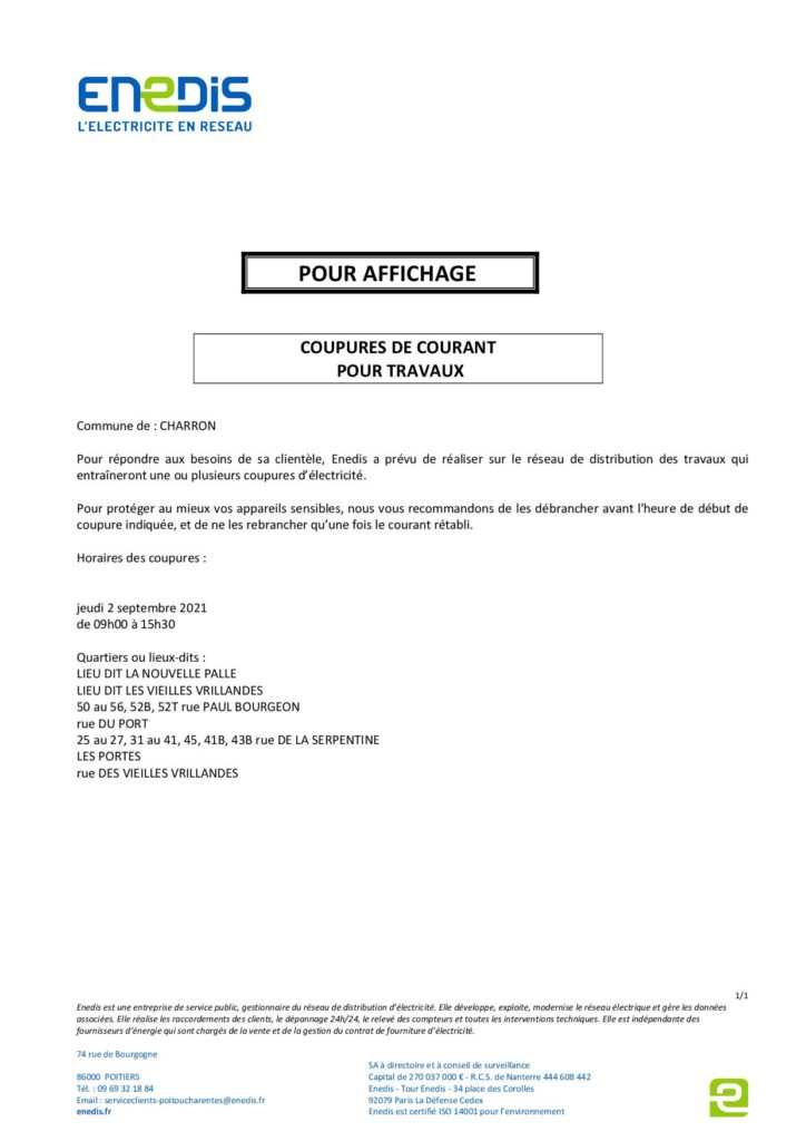 Enedis nous informe de coupures de courants sur différents secteurs de la commune le Jeudi 2 Septembre prochain.