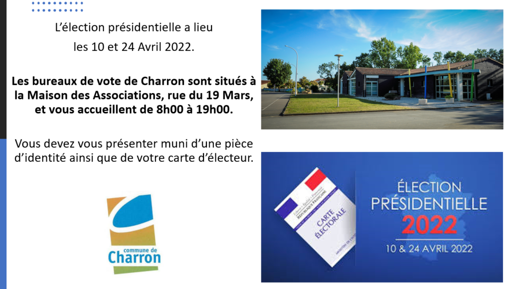 Les bureaux de vote de Charron sont situés à la Maison des Associations, rue du 19 Mars, et vous accueillent de 8h00 à 19h00.