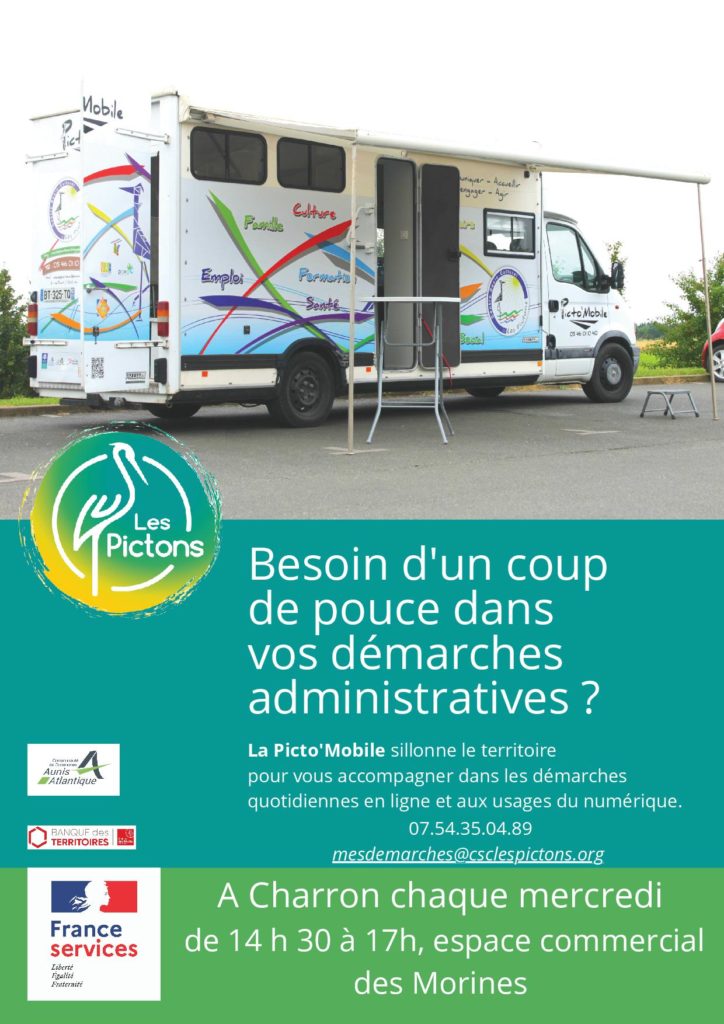 Dans le cadre du réseau France Services, la Picto’Mobile du centre socioculturel Les Pictons vous accueille tous les Mercredis de 14h30 à 17h00 sur la zone de commerces des Morines à partir du 21 Juillet.