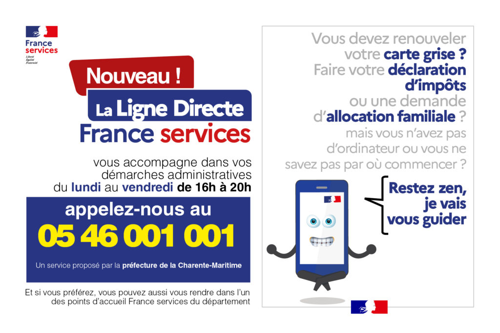 Vous n’avez pas le temps de gérer vos démarches administratives en journée ?La plateforme téléphonique Ligne Direct France Services est là pour vous renseigner de 16h00 à 20h00, du Lundi au Vendredi, au 05 46 00 10 01.