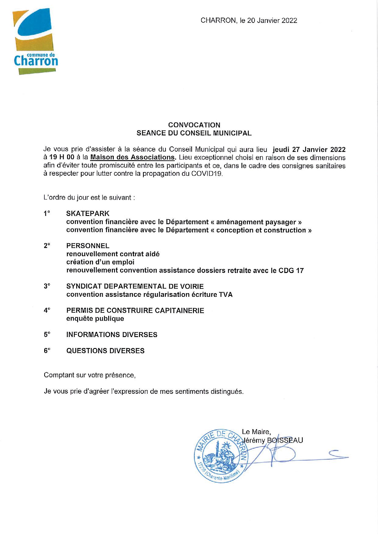 Le conseil municipal de Charron se réunira ce Jeudi 10 Mars à 19h00 Salle Basse de la Mairie.