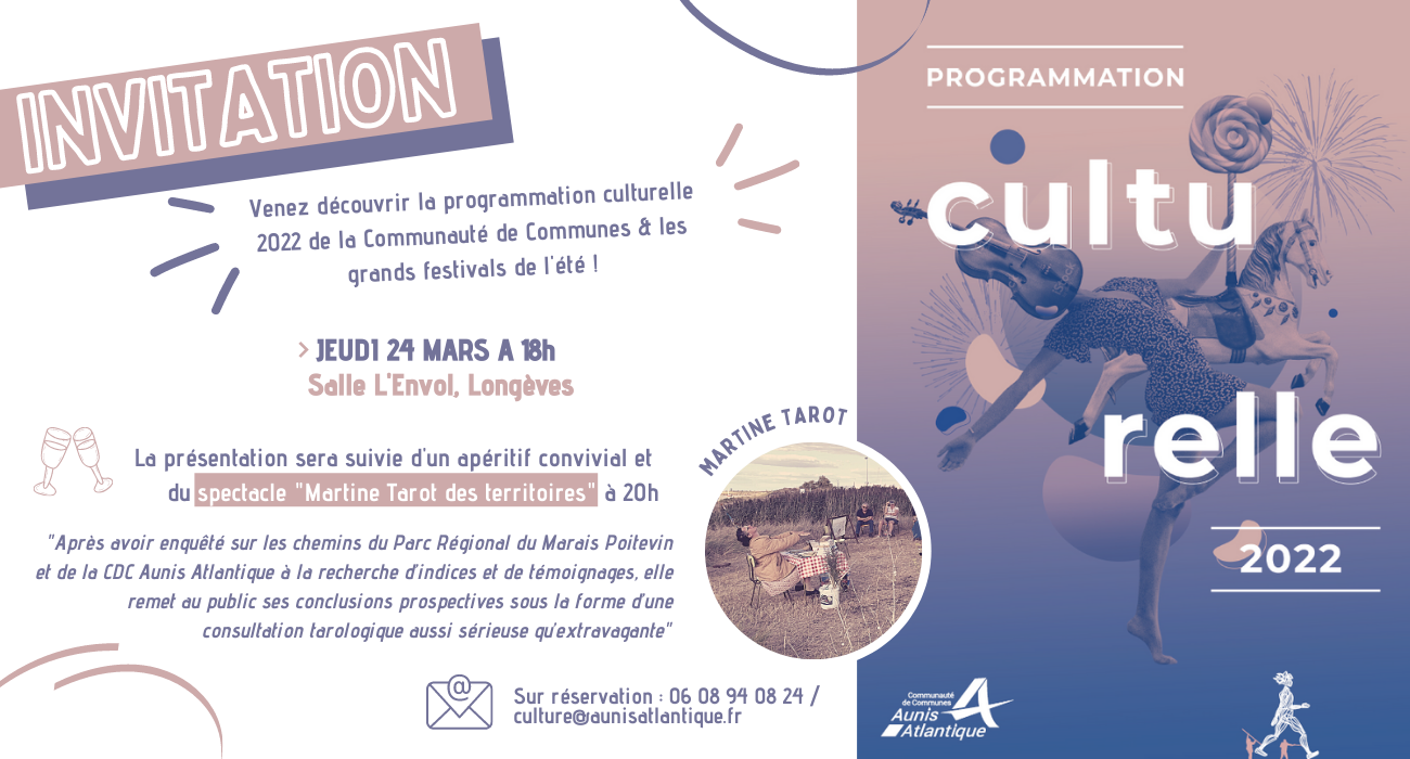 La Communauté de Communes Aunis Atlantique vous propose de découvrir en avant-première la programmation culturelle 2022 le Jeudi 24 Mars à 18h00 salle de L’envol à Longèves.