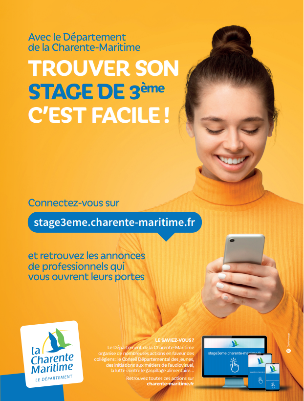 La plate-forme https://stage3eme.charente-maritime.fr, mise en place par le Département de la Charente-Maritime, fédère l’ensemble des offres de stage de découverte sur le territoire.