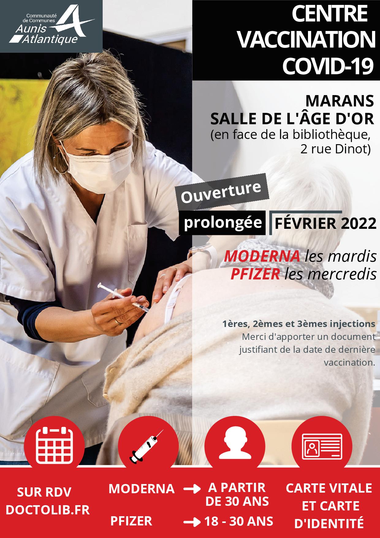 La Communauté de Communes Aunis Atlantique prolonge l’ouverture du centre de vaccination de Marans avec des créneaux les Mardis avec le Moderna pour les plus de 30 ans et les Mercredis avec le Pfizer pour les 12-30ans.